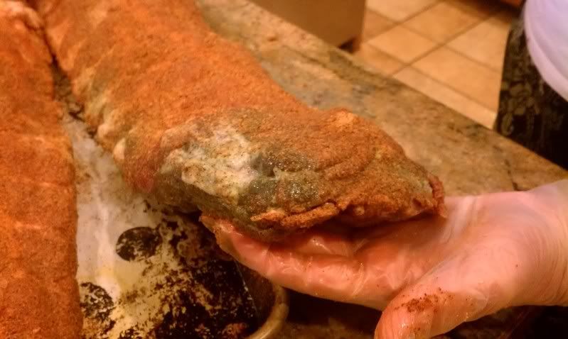 Picked up two packs of baby backs at costco to do today. Rubbed them last night and when I took them out to put them on, 3 of the racks looked like this.